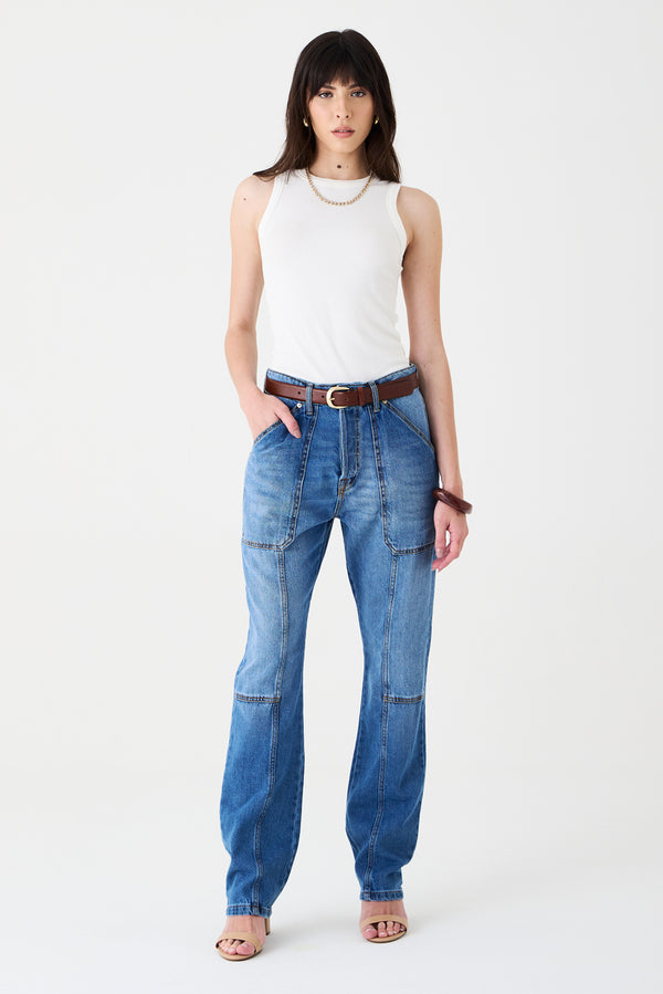 CALÇA ÍSIS FEMININA STRAIGHT RECORTES JEANS MÉDIO