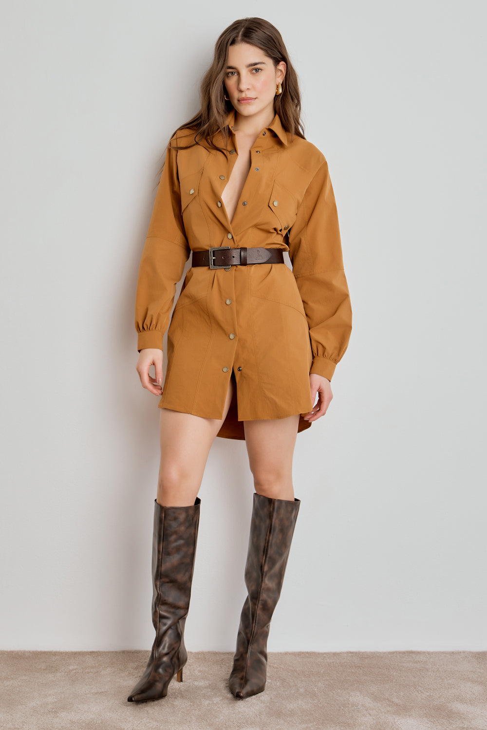 A Chemise Feminina Manga Longa Recortes - Caramelo é perfeita para produções que exigem elegância sem esforço. Combine com botas ou sandálias para um look refinado, ou use aberta com jeans e top para um visual casual com toque fashion. Ideal para ambientes profissionais, almoços especiais ou passeios urbanos, essa chemise se adapta a diferentes estilos com autenticidade.